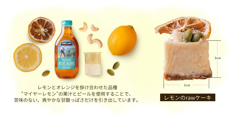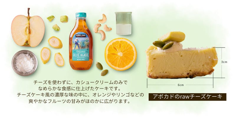 原材料名:カシューナッツ(インド産)、アガベシロップ、ココナッツオイル、 アーモンドプードル、バナナ、デーツ、アボカド、オ レンジ、りんご、レモン、ココナッツミルク、パンプ キンシード、ココナッツ、海塩